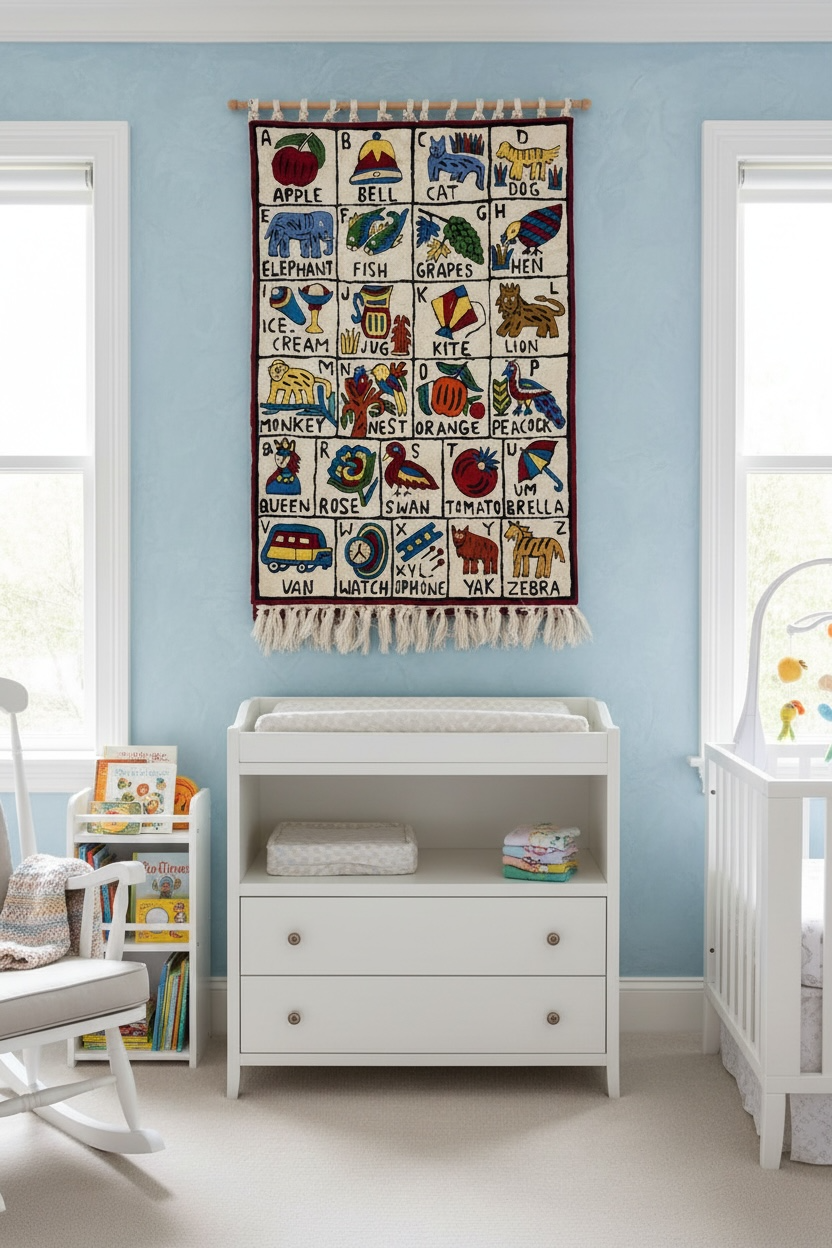 🧒 Each letter from A to Z is paired with a cheerful illustration—from apples and elephants to xylophones and zebras—making it an engaging and interactive addition to any nursery, playroom, or early learning space. The bold colors and tactile texture invite curiosity and conversation, while the handmade quality adds warmth and authenticity to your décor.