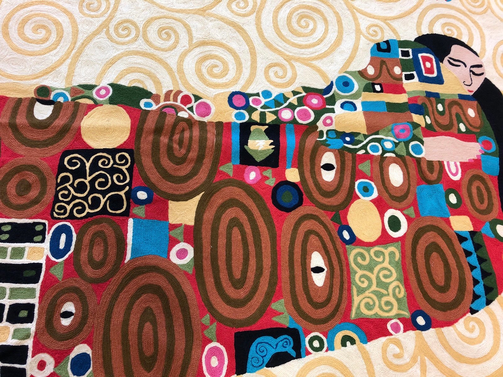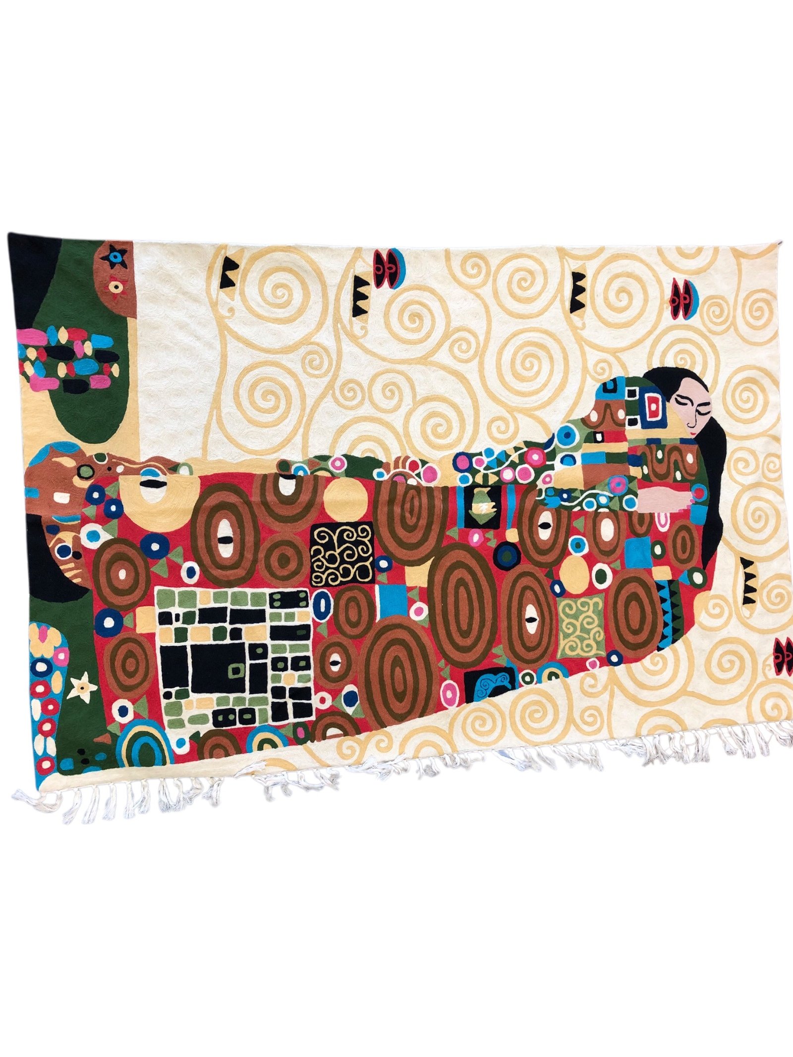 Wrap your space in the warmth of art and intimacy with Golden Embrace: Klimt Reverie — a stunning 6ft x 4ft hand-embroidered masterpiece inspired by Gustav Klimt’s iconic “The Kiss.” Every swirl, shimmer, and silhouette is brought to life through traditional Kashmiri chain stitch embroidery, echoing the golden opulence and emotional depth of Klimt’s vision.