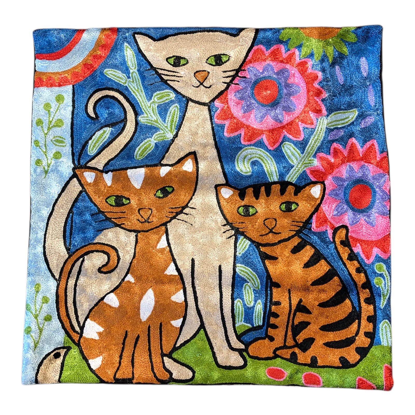 Keywords: handmade cushion cover, Kashmiri embroidered pillow, Laurel Burch cat cushion, floral textile pillow, chain stitch silk cushion, artisan home decor, whimsical animal cushion, colorful cat cushion cover