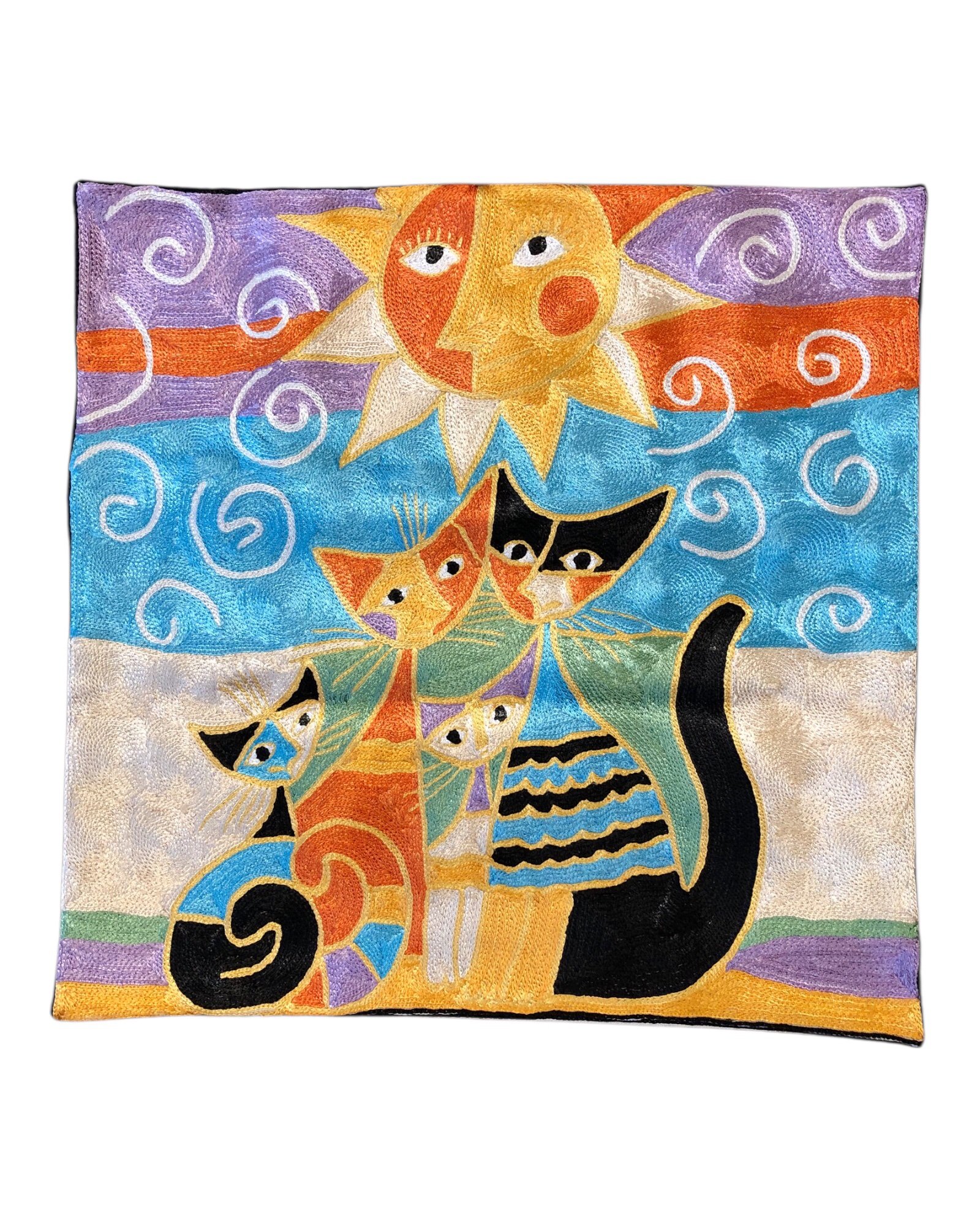 Keywords: handmade cushion cover, Kashmiri embroidered pillow, Rosina Wachtmeister cushion, cat art textile, celestial cushion