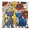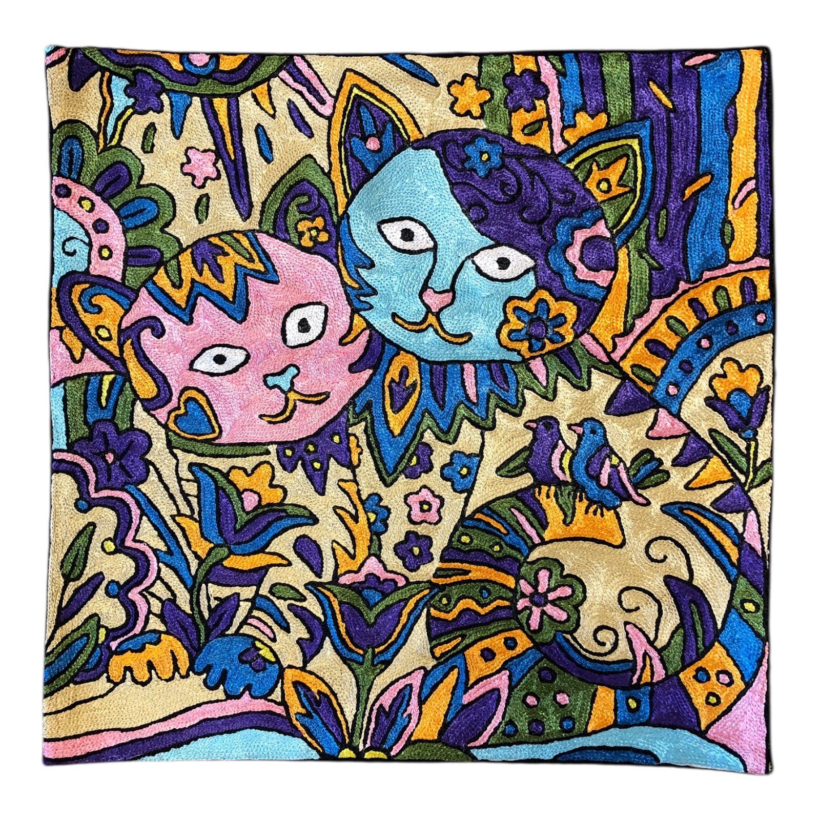 Channeling the opulence of Gustav Klimt, this cushion cover features two cats adorned with swirling motifs and golden hues. The intricate detailing and rich palette evoke the sensuality and elegance of Klimt’s iconic style—reimagined through Kashmiri embroidery.